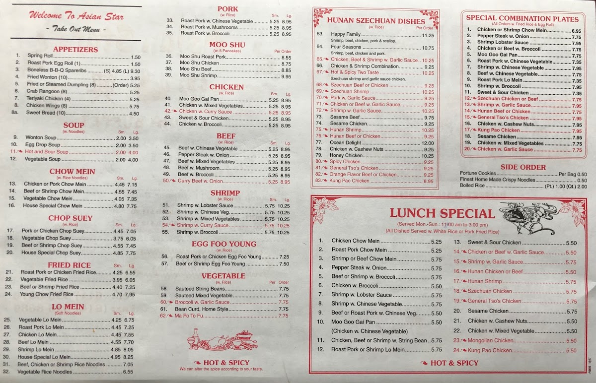 The menu at Asian Star China Buffet offers a relaxed and approachable selection, designed for casual dining and easy-going gatherings. It features a variety of familiar Chinese dishes served buffet-style, alongside a salad bar and tempting dessert options, making it a convenient choice for those seeking a straightforward, satisfying meal.